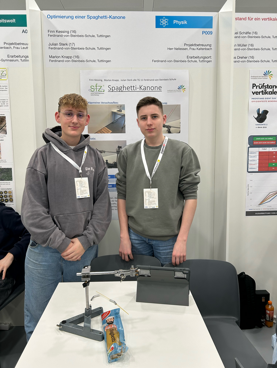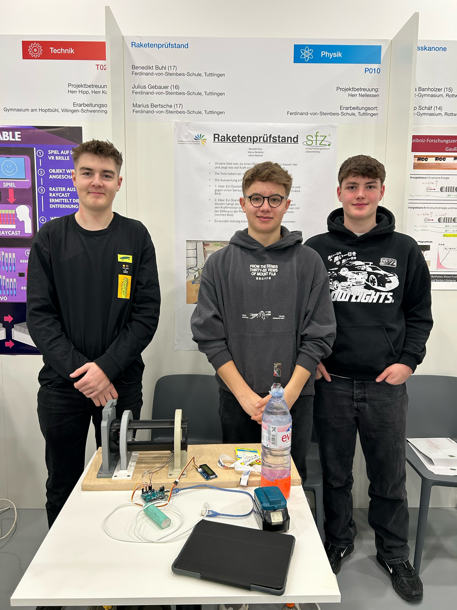 Im Fachbereich Physik belegten Marius Bertsche, Benedikt Buhl und Julius Gebauer (alle TG11) mit ihrem Raketenprüfstand einen hervorragenden dritten Platz. Finn Kessing, Marlon Knapp und Julian Sterk (alle TG11) erhielten für ihr Projekt „Optimierung einer Spaghetti-Kanone“ eine Teilnehmerurkunde.